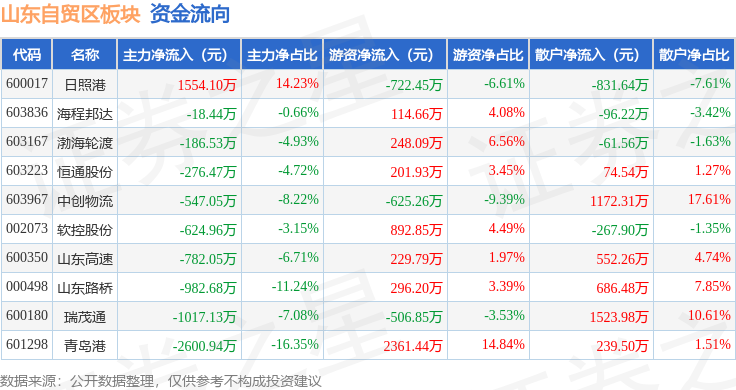 从资金流向上来看,当日山东自贸区板块主力资金净流出5482.15万元,游资资金净流入2490.39万元,散户资金净流入2991.76万元。山东自贸区板块个股资金流向见下表: