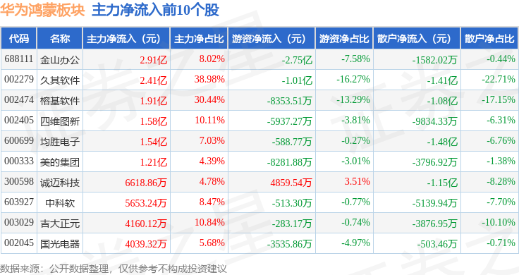 从资金流向上来看,当日华为鸿蒙板块主力资金净流入9.08亿元,游资资金净流出7.79亿元,散户资金净流出1.29亿元。华为鸿蒙板块个股资金流向见下表: