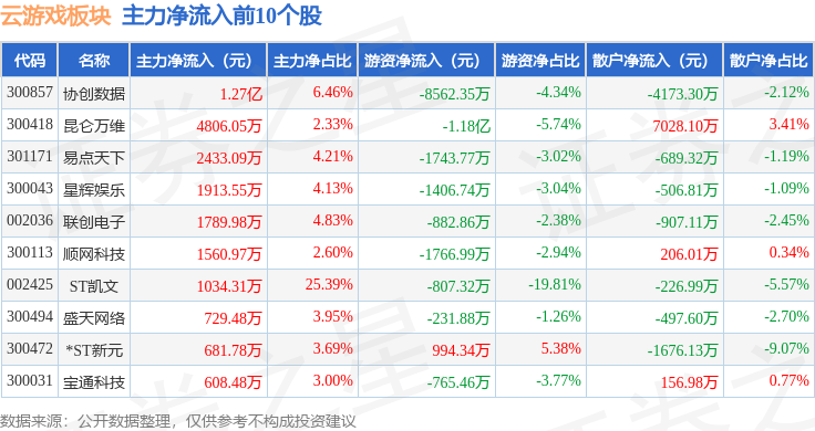 从资金流向上来看,当日云游戏板块主力资金净流出7.69亿元,游资资金净流入3912.05万元,散户资金净流入7.29亿元。云游戏板块个股资金流向见下表: