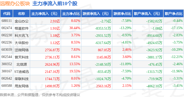 从资金流向上来看,当日远程办公板块主力资金净流入4.73亿元,游资资金净流出5.32亿元,散户资金净流入5927.96万元。远程办公板块个股资金流向见下表: