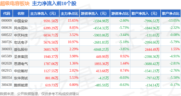 从资金流向上来看,当日超级电容板块主力资金净流出3.41亿元,游资资金净流出2.4亿元,散户资金净流入5.81亿元。超级电容板块个股资金流向见下表: