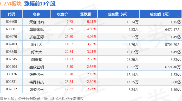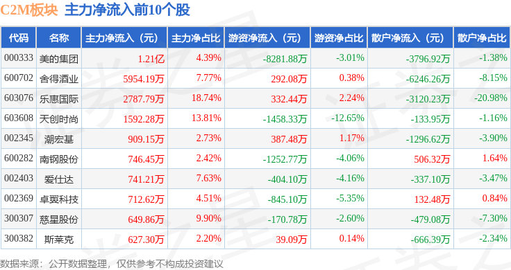 从资金流向上来看,当日C2M板块主力资金净流出2.39亿元,游资资金净流入6528.69万元,散户资金净流入1.74亿元。C2M板块个股资金流向见下表: