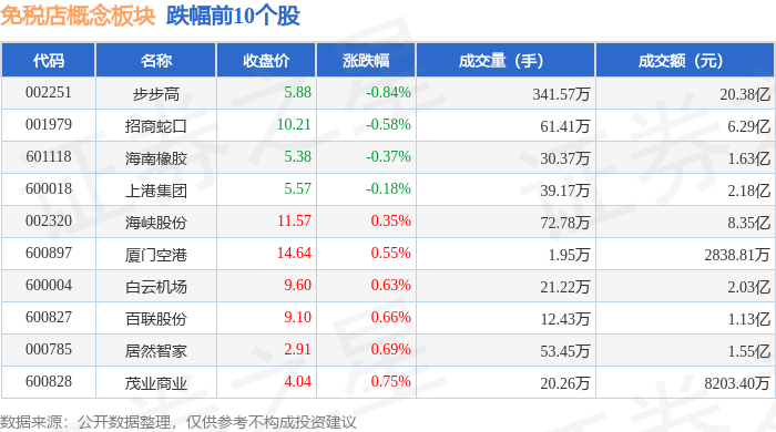 证券之星消息,10月15日免税店概念板块较上一交易日上涨1.2%,供销大集领涨。当日上证指数报收于3912.21,上涨1.22%。深证成指报收于13118.75,上涨1.73%。免税店概念板块个股涨跌见下表: