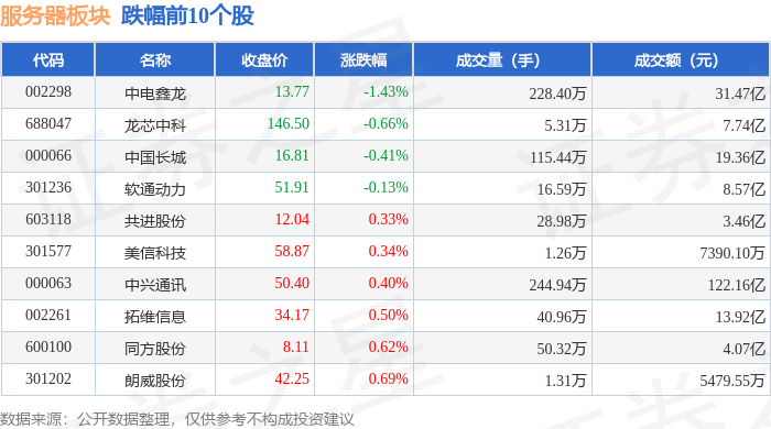 从资金流向上来看,当日服务器板块主力资金净流入1.54亿元,游资资金净流出7.04亿元,散户资金净流入5.51亿元。服务器板块个股资金流向见下表: