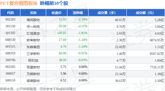 证券之星消息,10月15日PET复合铜箔板块较上一交易日上涨1.77%,嘉元科技领涨。当日上证指数报收于3912.21,上涨1.22%。深证成指报收于13118.75,上涨1.73%。PET复合铜箔板块个股涨跌见下表: