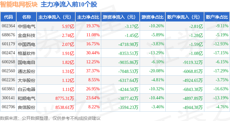 从资金流向上来看,当日智能电网板块主力资金净流入11.32亿元,游资资金净流出14.52亿元,散户资金净流入3.2亿元。智能电网板块个股资金流向见下表: