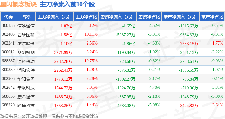 从资金流向上来看,当日星闪概念板块主力资金净流入586.58万元,游资资金净流出3.54亿元,散户资金净流入3.48亿元。星闪概念板块个股资金流向见下表: