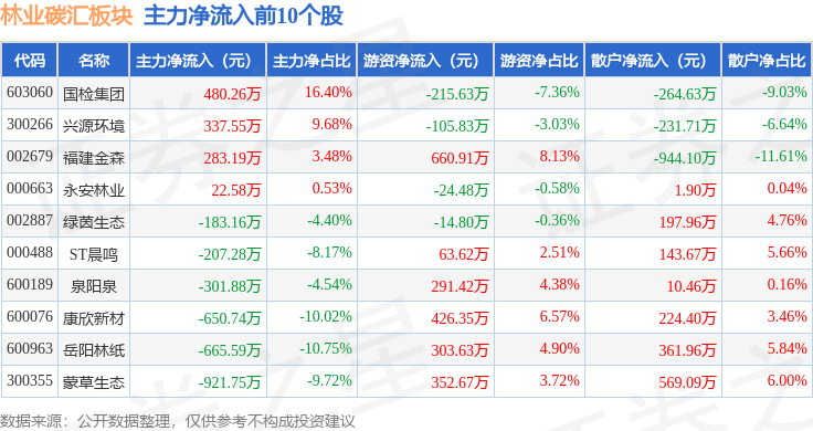 从资金流向上来看,当日林业碳汇板块主力资金净流出2801.97万元,游资资金净流入1001.18万元,散户资金净流入1800.78万元。林业碳汇板块个股资金流向见下表: