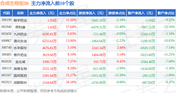 从资金流向上来看,当日合成生物板块主力资金净流出2.89亿元,游资资金净流入1.47亿元,散户资金净流入1.43亿元。合成生物板块个股资金流向见下表: