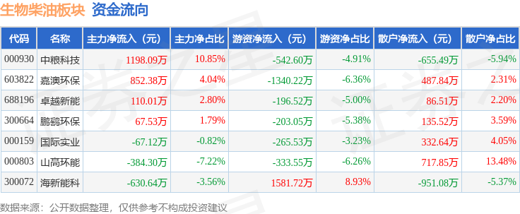 从资金流向上来看,当日生物柴油板块主力资金净流入1145.95万元,游资资金净流出1299.74万元,散户资金净流入153.79万元。生物柴油板块个股资金流向见下表: