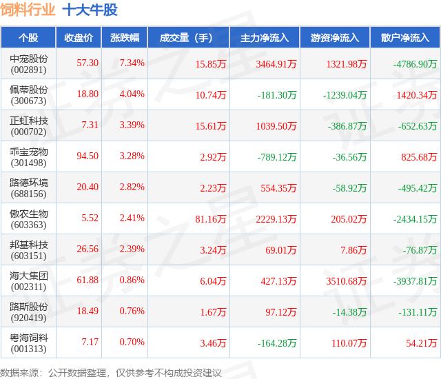 个股表现方面,饲料行业当日领涨股为中宠股份(002891),该股当日报收57.3,上涨7.34%,成交量15.85万,主力资金净流入3464.91万元。佩蒂股份(300673)以上涨4.04%紧随其后,该股当日成交量10.74万,主力资金净流出181.3万元。除此之外,正虹科技(000702)、乖宝宠物(301498)、路德环境(688156)均进入当日牛股之列。具体个股列表见下表:
