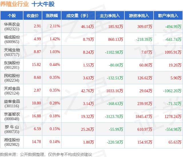 个股表现方面,养殖业行业当日领涨股为华英农业(002321),该股当日报收2.91,上涨2.11%,成交量46.14万,主力资金净流入185.92万元。福成股份(600965)以上涨1.42%紧随其后,该股当日成交量8.79万,主力资金净流入860.13万元。除此之外,天域生物(603717)、东瑞股份(001201)、民和股份(002234)均进入当日牛股之列。具体个股列表见下表: