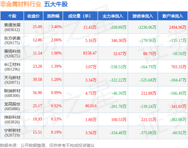 个股表现方面,非金属材料行业当日领涨股为索通发展(603612),该股当日报收25.09,上涨3.46%,成交量15.43万,主力资金净流出258.89万元。东方碳素(920175)以上涨2.06%紧随其后,该股当日成交量5.16万,主力资金净流入346.3万元。除此之外,秉扬科技(920675)、长江材料(001296)、天马新材(920971)均进入当日牛股之列。具体个股列表见下表: