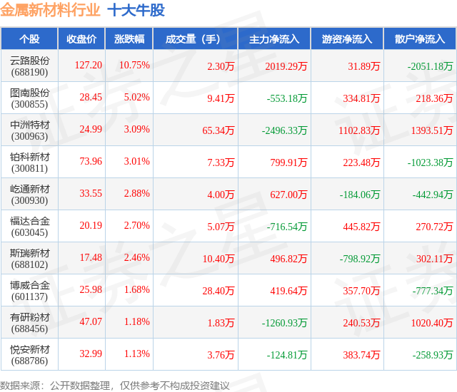个股表现方面,金属新材料行业当日领涨股为云路股份(688190),该股当日报收127.2,上涨10.75%,成交量2.3万,主力资金净流入2019.29万元。图南股份(300855)以上涨5.02%紧随其后,该股当日成交量9.41万,主力资金净流出553.18万元。除此之外,中洲特材(300963)、铂科新材(300811)、屹通新材(300930)均进入当日牛股之列。具体个股列表见下表: