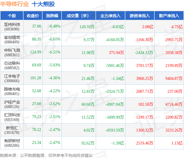 个股表现方面,半导体行业当日领跌股为至纯科技(603690),该股当日报收37.0,下跌8.48%,成交量120.59万,主力资金净流出6.83亿元。富创精密(688409)以下跌6.61%紧随其后,该股当日成交量9.37万,主力资金净流出4160.05万元。除此之外,中科飞测(688361)、芯动联科(688582)、江丰电子(300666)均进入当日熊股之列。具体个股列表见下表: