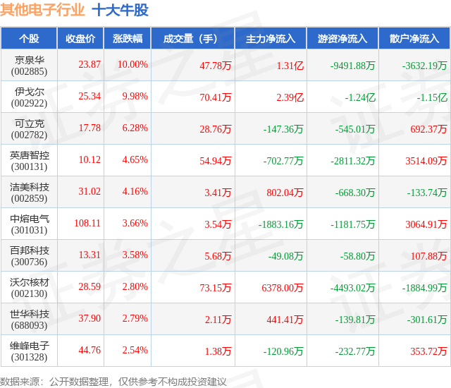 个股表现方面,其他电子行业当日领涨股为京泉华(002885),该股当日报收23.87,上涨10.0%,成交量47.78万,主力资金净流入1.31亿元。伊戈尔(002922)以上涨9.98%紧随其后,该股当日成交量70.41万,主力资金净流入2.39亿元。除此之外,可立克(002782)、英唐智控(300131)、洁美科技(002859)均进入当日牛股之列。具体个股列表见下表:
