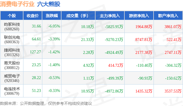 个股表现方面,消费电子行业当日领跌股为昀冢科技(688260),该股当日报收31.66,下跌6.05%,成交量10.18万,主力资金净流出5825.95万元。联创光电(600363)以下跌3.39%紧随其后,该股当日成交量21.33万,主力资金净流出9270.23万元。除此之外,捷邦科技(301326)、易天股份(300812)、威贸电子(920346)均进入当日熊股之列。具体个股列表见下表: