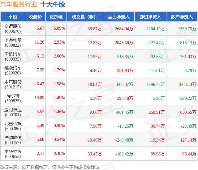 个股表现方面,汽车服务行业当日领涨股为交运股份(600676),该股当日报收6.67,上涨6.89%,成交量39.87万,主力资金净流入2684.94万元。上海物贸(600822)以上涨2.93%紧随其后,该股当日成交量12.85万,主力资金净流入2043.6万元。除此之外,国机汽车(600335)、德众汽车(920030)、中汽股份(301215)均进入当日牛股之列。具体个股列表见下表: