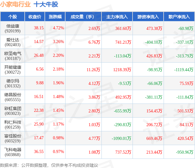 个股表现方面,小家电行业当日领涨股为倍益康(920199),该股当日报收38.15,上涨4.72%,成交量2.69万,主力资金净流入361.6万元。爱仕达(002403)以上涨3.26%紧随其后,该股当日成交量6.76万,主力资金净流入741.21万元。除此之外,欧圣电气(301187)、开能健康(300272)、德尔玛(301332)均进入当日牛股之列。具体个股列表见下表: