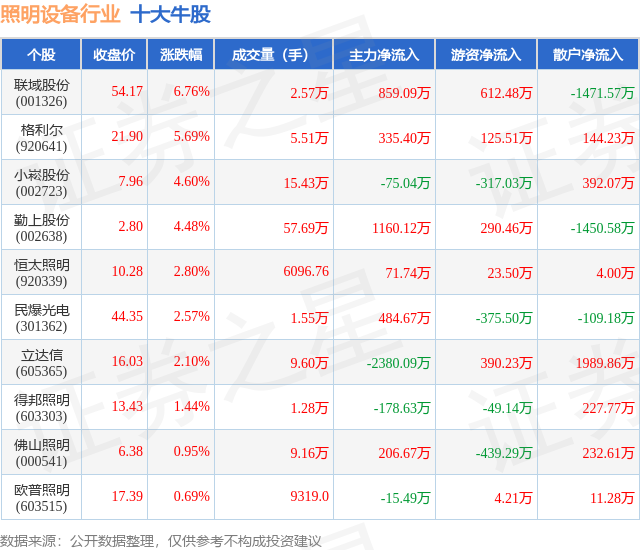 个股表现方面,照明设备行业当日领涨股为联域股份(001326),该股当日报收54.17,上涨6.76%,成交量2.57万,主力资金净流入859.09万元。格利尔(920641)以上涨5.69%紧随其后,该股当日成交量5.51万,主力资金净流入335.4万元。除此之外,小崧股份(002723)、勤上股份(002638)、恒太照明(920339)均进入当日牛股之列。具体个股列表见下表:
