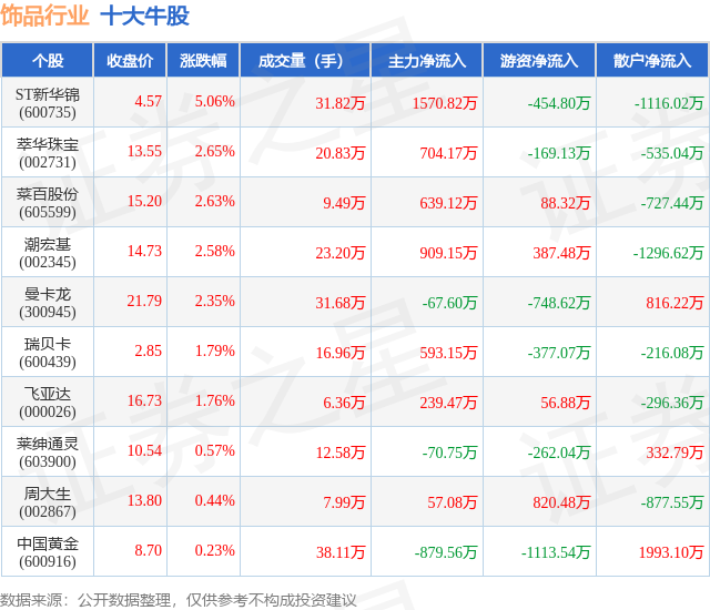 个股表现方面,饰品行业当日领涨股为ST新华锦(600735),该股当日报收4.57,上涨5.06%,成交量31.82万,主力资金净流入1570.82万元。萃华珠宝(002731)以上涨2.65%紧随其后,该股当日成交量20.83万,主力资金净流入704.17万元。除此之外,菜百股份(605599)、潮宏基(002345)、曼卡龙(300945)均进入当日牛股之列。具体个股列表见下表: