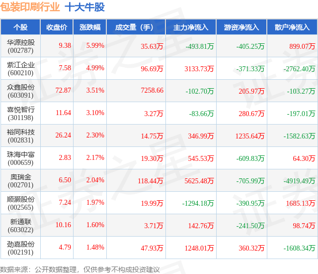 个股表现方面,包装印刷行业当日领涨股为华源控股(002787),该股当日报收9.38,上涨5.99%,成交量35.63万,主力资金净流出493.81万元。紫江企业(600210)以上涨4.99%紧随其后,该股当日成交量96.69万,主力资金净流入3133.73万元。除此之外,众鑫股份(603091)、喜悦智行(301198)、裕同科技(002831)均进入当日牛股之列。具体个股列表见下表:
