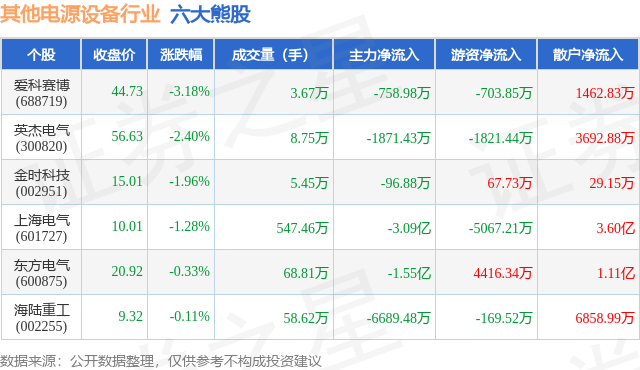 个股表现方面,其他电源设备行业当日领跌股为爱科赛博(688719),该股当日报收44.73,下跌3.18%,成交量3.67万,主力资金净流出758.98万元。英杰电气(300820)以下跌2.4%紧随其后,该股当日成交量8.75万,主力资金净流出1871.43万元。除此之外,金时科技(002951)、上海电气(601727)、东方电气(600875)均进入当日熊股之列。具体个股列表见下表: