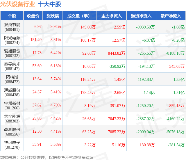 个股表现方面,光伏设备行业当日领涨股为双良节能(600481),该股当日报收6.97,上涨9.94%,成交量149.0万,主力资金净流入2.59亿元。阳光电源(300274)以上涨8.31%紧随其后,该股当日成交量108.17万,主力资金净流入12.57亿元。除此之外,爱旭股份(600732)、微导纳米(688147)、阿特斯(688472)均进入当日牛股之列。具体个股列表见下表: