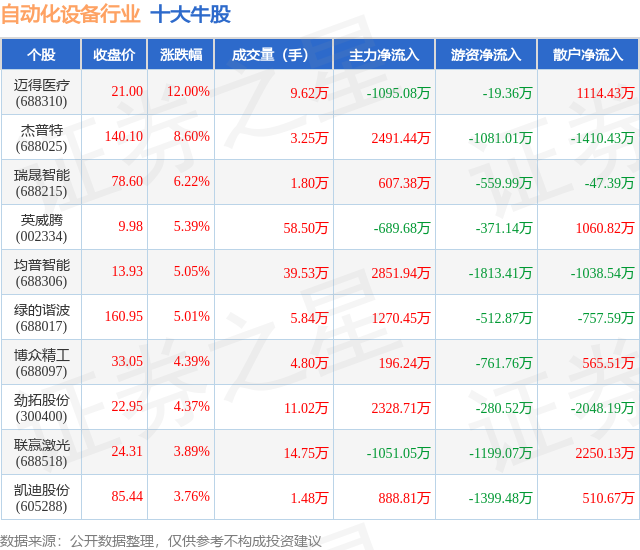 个股表现方面,自动化设备行业当日领涨股为迈得医疗(688310),该股当日报收21.0,上涨12.0%,成交量9.62万,主力资金净流出1095.08万元。杰普特(688025)以上涨8.6%紧随其后,该股当日成交量3.25万,主力资金净流入2491.44万元。除此之外,瑞晟智能(688215)、英威腾(002334)、均普智能(688306)均进入当日牛股之列。具体个股列表见下表: