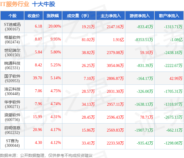 个股表现方面,IT服务行业当日领涨股为ST迪威迅(300167),该股当日报收6.18,上涨20.0%,成交量19.21万,主力资金净流入2147.16万元。榕基软件(002474)以上涨9.95%紧随其后,该股当日成交量81.02万,主力资金净流入1.91亿元。除此之外,世纪瑞尔(300150)、皖通科技(002331)、国子软件(920953)均进入当日牛股之列。具体个股列表见下表:
