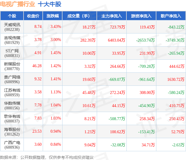 个股表现方面,电视广播行业当日领涨股为天威视讯(002238),该股当日报收8.74,上涨3.43%,成交量18.27万,主力资金净流入723.79万元。吉视传媒(601929)以上涨3.0%紧随其后,该股当日成交量282.39万,主力资金净流入6403.04万元。除此之外,ST广网(600831)、新媒股份(300770)、贵广网络(600996)均进入当日牛股之列。具体个股列表见下表: