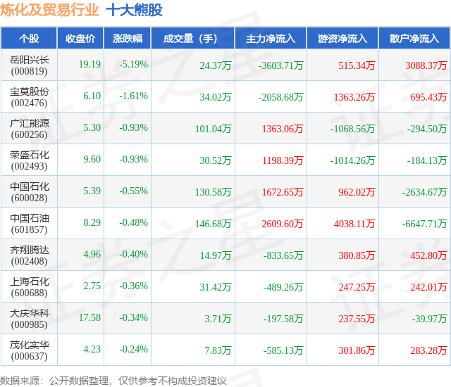 个股表现方面,炼化及贸易行业当日领跌股为岳阳兴长(000819),该股当日报收19.19,下跌5.19%,成交量24.37万,主力资金净流出3603.71万元。宝莫股份(002476)以下跌1.61%紧随其后,该股当日成交量34.02万,主力资金净流出2058.68万元。除此之外,广汇能源(600256)、荣盛石化(002493)、中国石化(600028)均进入当日熊股之列。具体个股列表见下表: