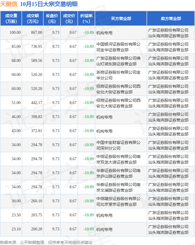 证券之星消息,10月15日天融信发生大宗交易,交易数据如下: