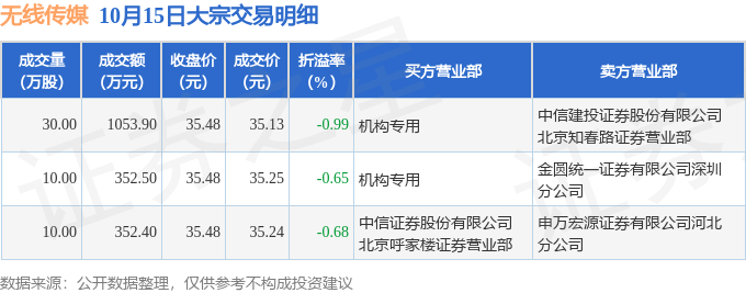 证券之星消息,10月15日无线传媒发生大宗交易,交易数据如下: