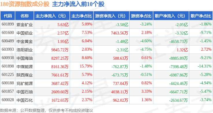 资金流向方面,180资源(000026)指数成份股当日主力资金净流出合计5.79亿元,游资资金净流出合计1.88亿元,散户资金净流入合计7.67亿元。成份股资金流向详情见下表: