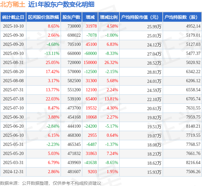 从股价来看,2025年9月10日至2025年10月10日,北方稀土区间涨幅为6.32%,在此期间股东户数增加7.0万户,增幅为10.61%。