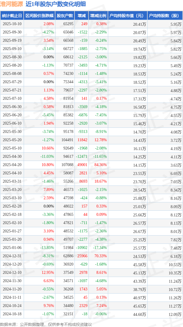 从股价来看,2025年9月30日至2025年10月10日,淮河能源区间涨幅为2.08%,在此期间股东户数增加249.0户,增幅为0.38%。