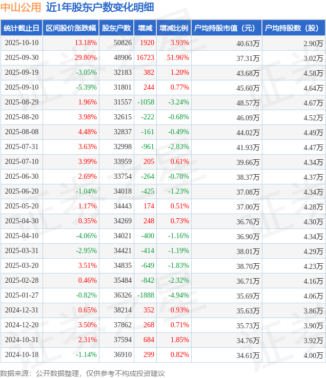 从股价来看,2025年9月30日至2025年10月10日,中山公用区间涨幅为13.18%,在此期间股东户数增加1920.0户,增幅为3.93%。