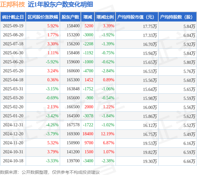 证券之星消息,近日正邦科技披露,截至2025年9月19日公司股东户数为15.84万户,较8月20日增加5200.0户,增幅为3.39%。户均持股数量由上期的6.04万股减少至5.84万股,户均持股市值为17.75万元。