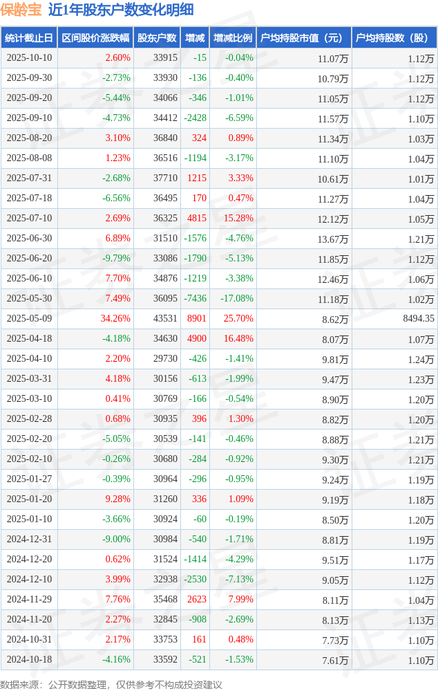 从股价来看,2025年9月30日至2025年10月10日,保龄宝区间涨幅为2.6%,在此期间股东户数减少15.0户,减幅为0.04%。