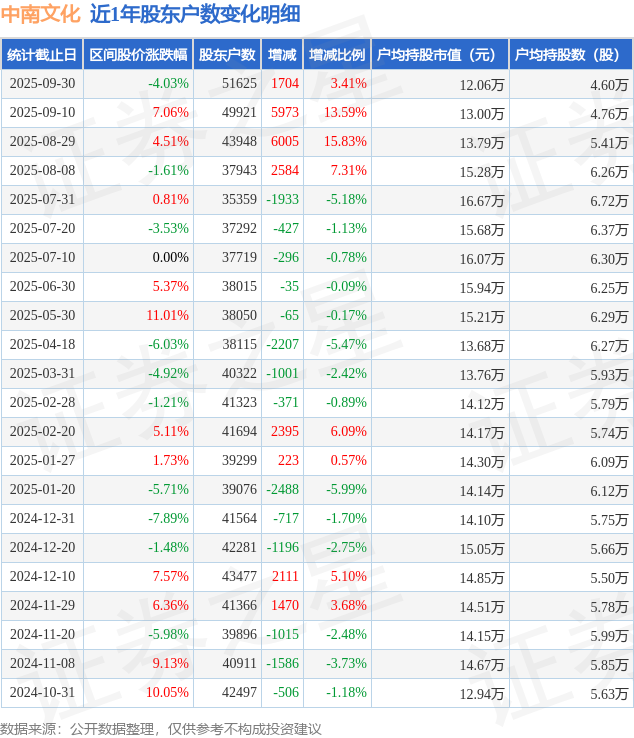 从股价来看,2025年9月10日至2025年9月30日,中南文化区间跌幅为4.03%,在此期间股东户数增加1704.0户,增幅为3.41%。