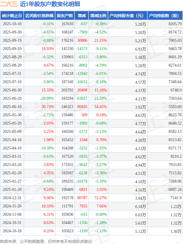 从股价来看,2025年9月30日至2025年10月10日,二六三区间跌幅为0.31%,在此期间股东户数减少637.0户,减幅为0.38%。
