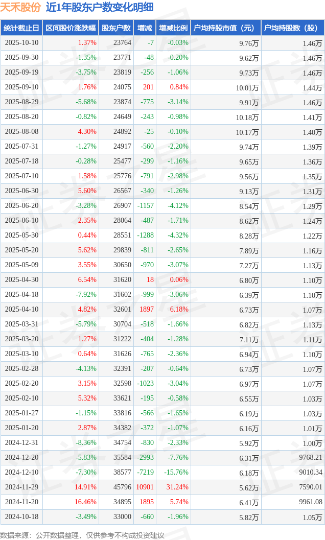从股价来看,2025年9月30日至2025年10月10日,天禾股份区间涨幅为1.37%,在此期间股东户数减少7.0户,减幅为0.03%。