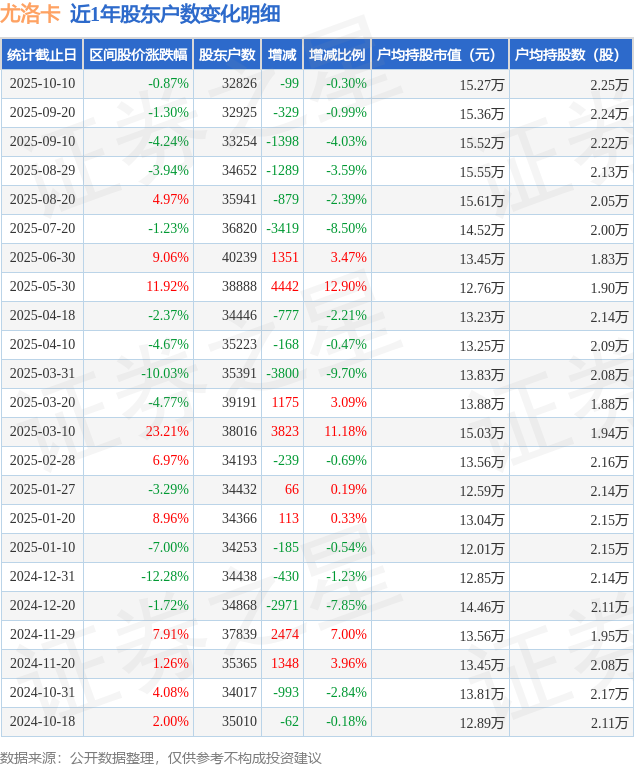 证券之星消息,近日尤洛卡披露,截至2025年10月10日公司股东户数为3.28万户,较9月20日减少99.0户,减幅为0.3%。户均持股数量由上期的2.24万股增加至2.25万股,户均持股市值为15.27万元。