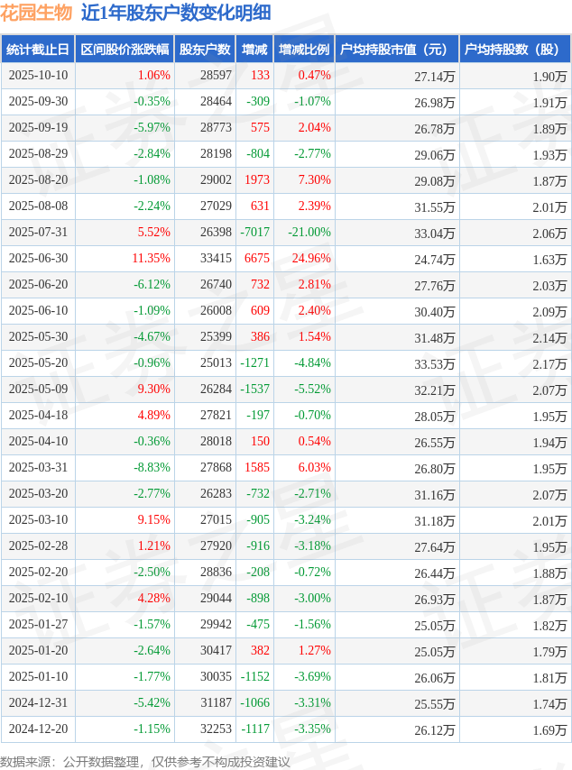 从股价来看,2025年9月30日至2025年10月10日,花园生物区间涨幅为1.06%,在此期间股东户数增加133.0户,增幅为0.47%。