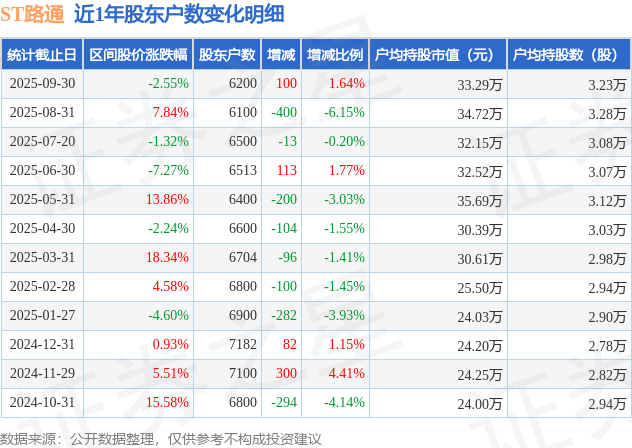 从股价来看,2025年8月31日至2025年9月30日,ST路通区间跌幅为2.55%,在此期间股东户数增加100.0户,增幅为1.64%。