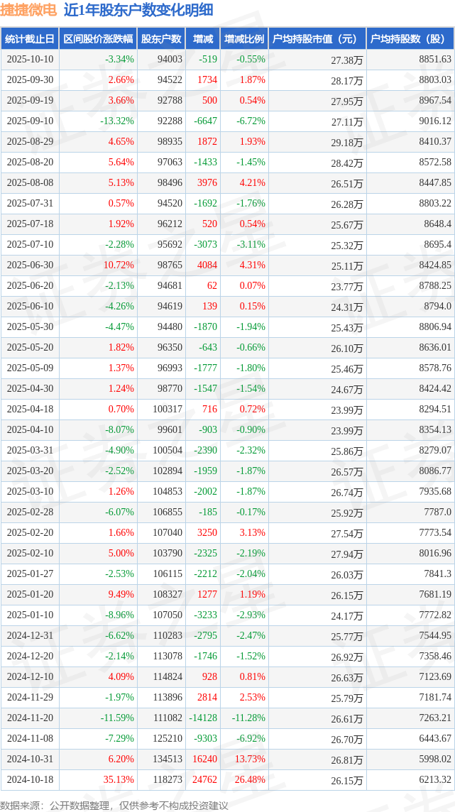 从股价来看,2025年9月30日至2025年10月10日,捷捷微电区间跌幅为3.34%,在此期间股东户数减少519.0户,减幅为0.55%。