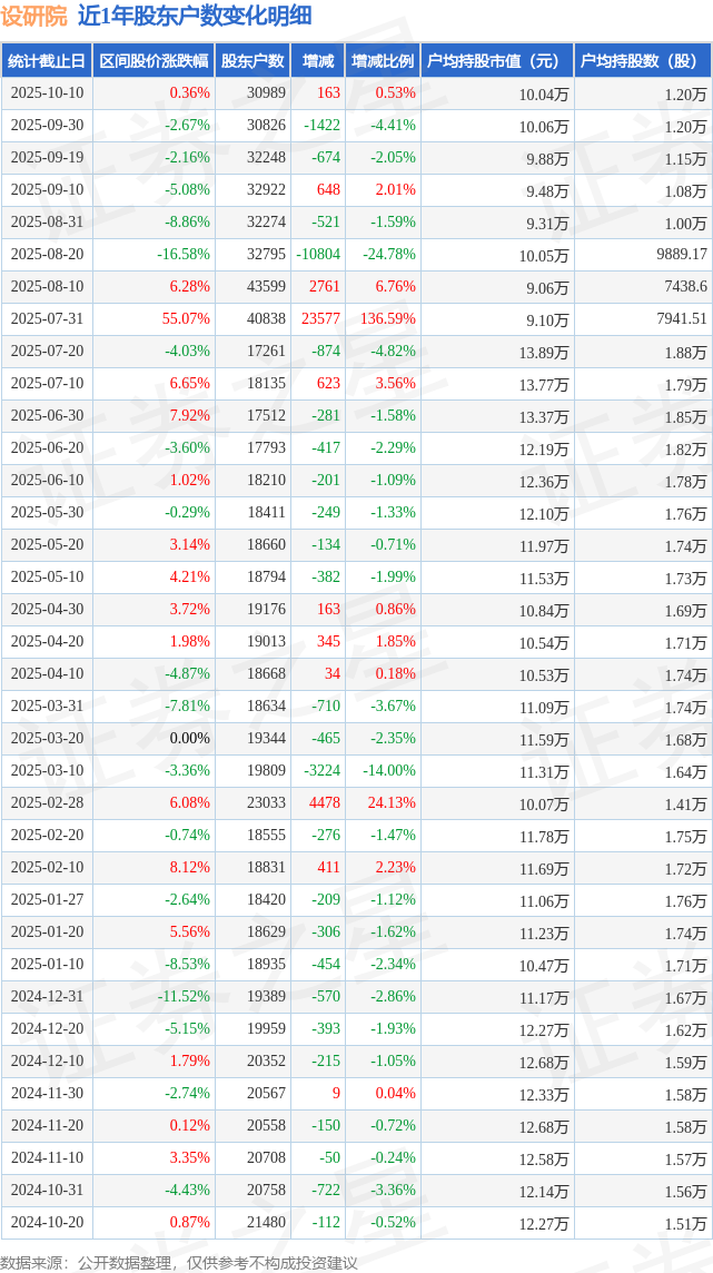 从股价来看,2025年9月30日至2025年10月10日,设研院区间涨幅为0.36%,在此期间股东户数增加163.0户,增幅为0.53%。