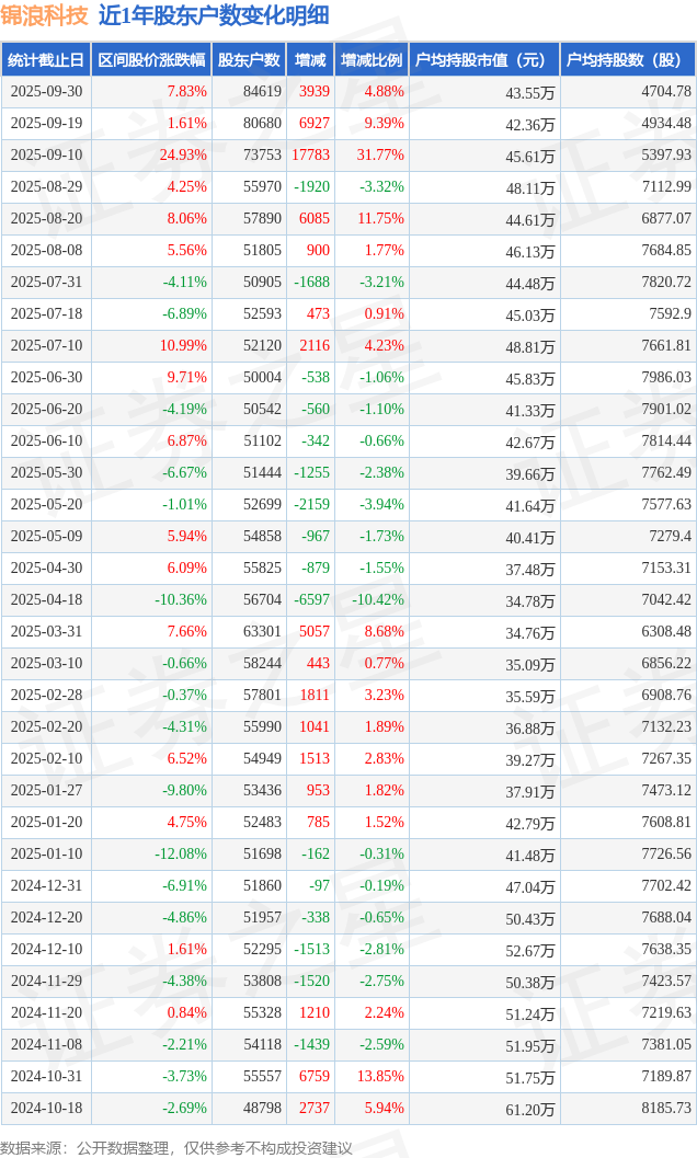 从股价来看,2025年9月19日至2025年9月30日,锦浪科技区间涨幅为7.83%,在此期间股东户数增加3939.0户,增幅为4.88%。