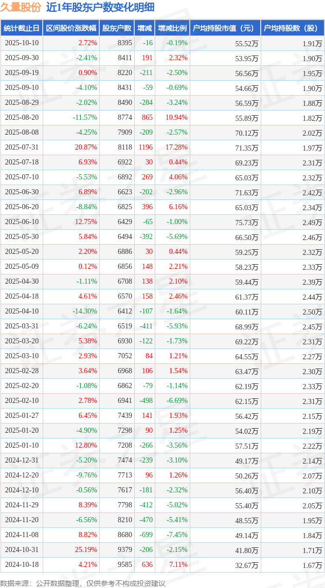 从股价来看,2025年9月30日至2025年10月10日,久量股份区间涨幅为2.72%,在此期间股东户数减少16.0户,减幅为0.19%。